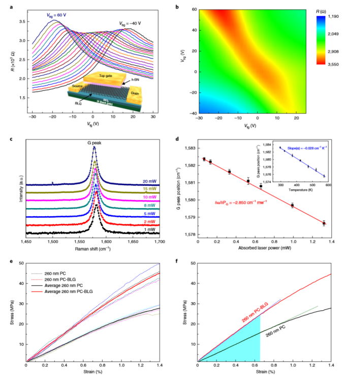 Fig. 4 AB堆疊雙層石墨烯薄膜的電傳輸測量,導熱率測量和拉伸測試。