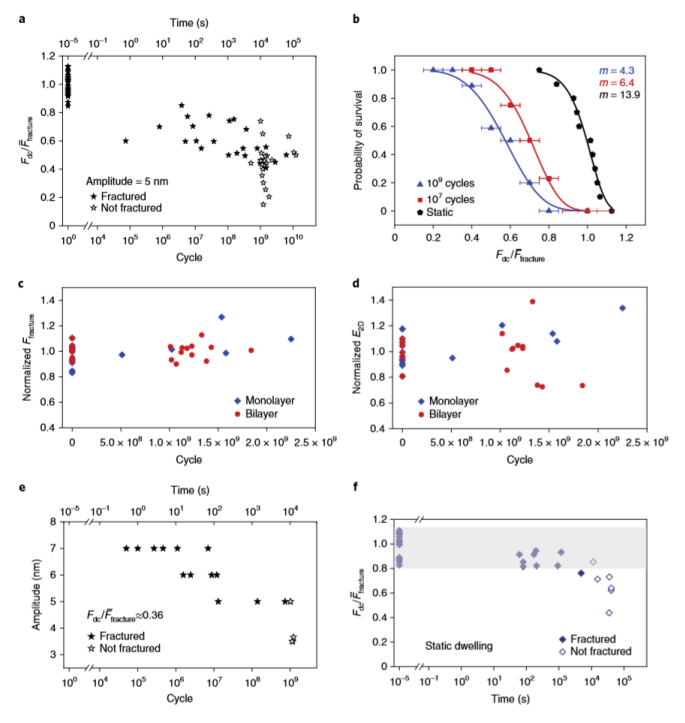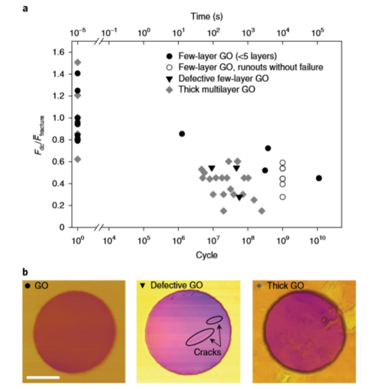 相關研究成果于2020年由加拿大多倫多大學Tobin Filleter課題組,發(fā)表在Nature Materials (https://doi.org/10.1038/s41563-019-0586-y)上。原文: Fatigue of graphene