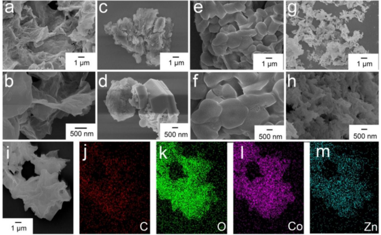 Figure 1. (a,b)ZnCoO-G,(c,d)ZnCoO,(e,f)ZnCoC和(g,h)CoO-G的SEM圖像; (i)ZnCoO-G的SEM圖像及其(j-m)元素映射圖像。