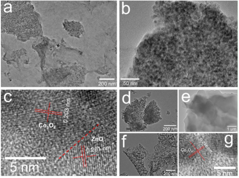 Figure 2. ZnCoO-G的(a,b)TEM和(c)HRTEM圖像; (d)ZnCoO,(e)ZnCoC和(f)CoO-G的TEM圖像; (g)CoO-G的HRTEM圖像。
