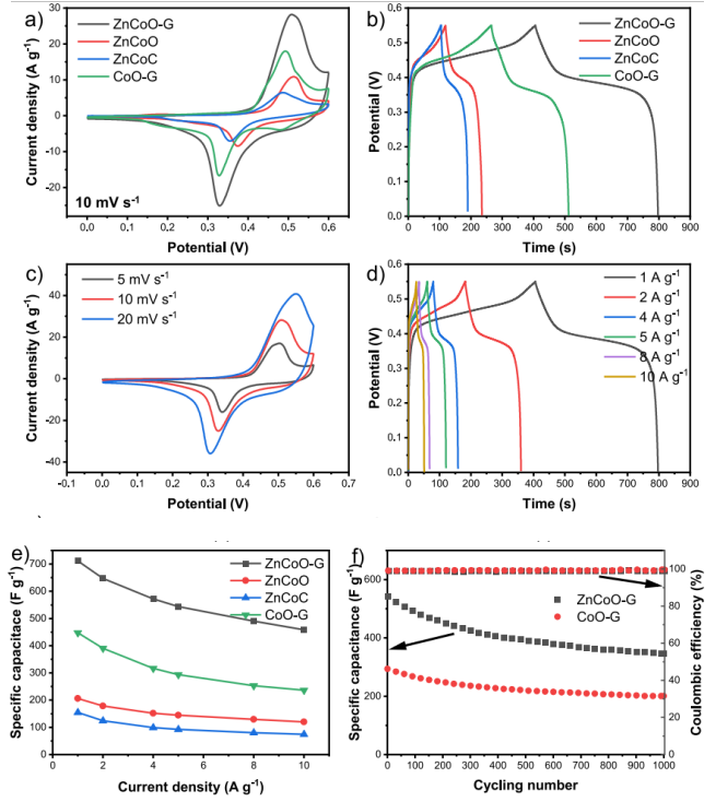 Figure 3. (a)ZnCoO-G,ZnCoO,ZnCoC和CoO-G的CV曲線;(b)電流密度為1 A/g時ZnCoO-G,ZnCoO,ZnCoC和CoO-G的GCD曲線;(c)ZnCoO-G在不同掃描速率下的CV曲線;(d)ZnCoO-G在不同電流密度下的GCD曲線;(e)在不同電流密度下,根據(jù)ZnCoO-G,ZnCoO,ZnCoC和CoO-G的GCD曲線計算出的比電容;(f)電流密度為5 A/g時,ZnCoO-G的循環(huán)穩(wěn)定性和庫侖效率。