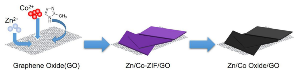 Figure 5. 源自Zn/Co-ZIF/GO的Zn/Co氧化物/GO的示意圖。
