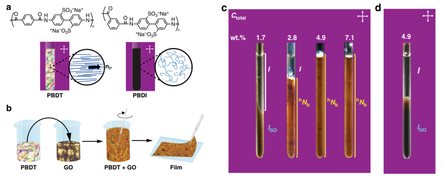將聚合物與少量硬質(zhì)碳基納米填料(例如石墨烯或氧化石墨烯)結(jié)合使用,有望產(chǎn)生具有出色機械性能的低密度納米復合材料。然而,填料和聚合物之間的不相容性,由于加工困難而進一步加劇,促使這種納米復合材料仍然難以捉摸。在這里,我們報告了一種通過簡單混合兩種液晶溶液來獲得高度增強的納米復合薄膜的水基工藝:一種由氧化石墨烯薄片組成的膠體向列相,以及一種由棒狀高性能芳族聚酰胺形成的向列相。干燥所得的雜化雙軸向列相后,我們獲得了用氧化石墨烯增強的堅固的結(jié)構(gòu)納米復合材料。