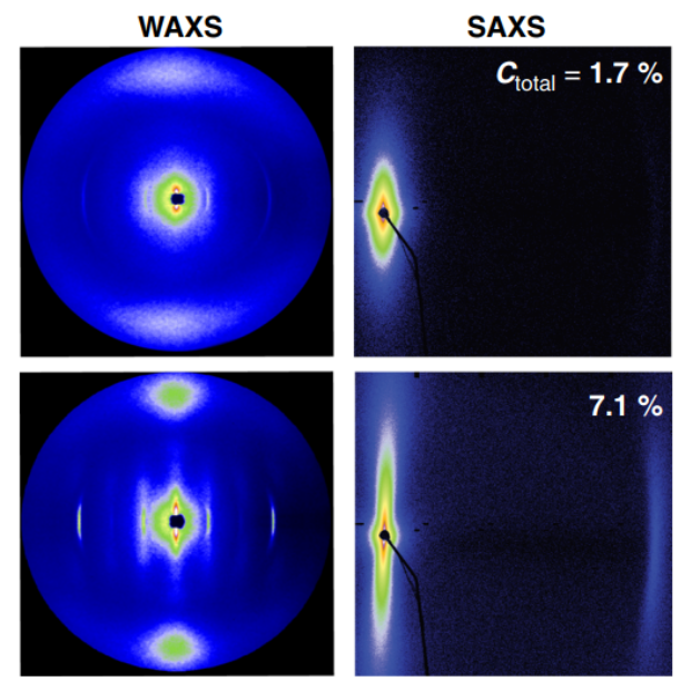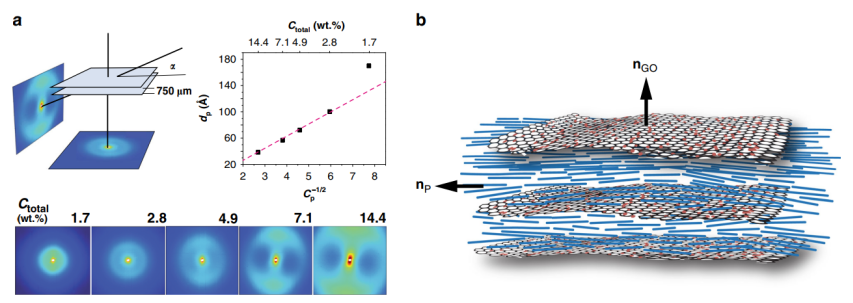 Figure 2. PBDT + GO混合向列相的表征。(a) 來自傳輸池中的PBDT + GO混合液的小角度X射線散射。(b)