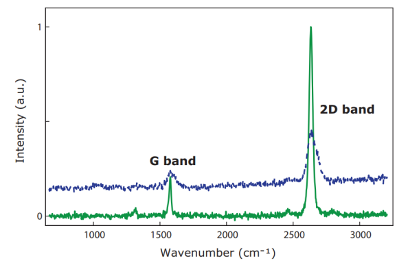 Figure 1. 由cw激光器(綠線)和sub-ps脈沖激光器(藍線)激發的石墨烯的拉曼光譜
