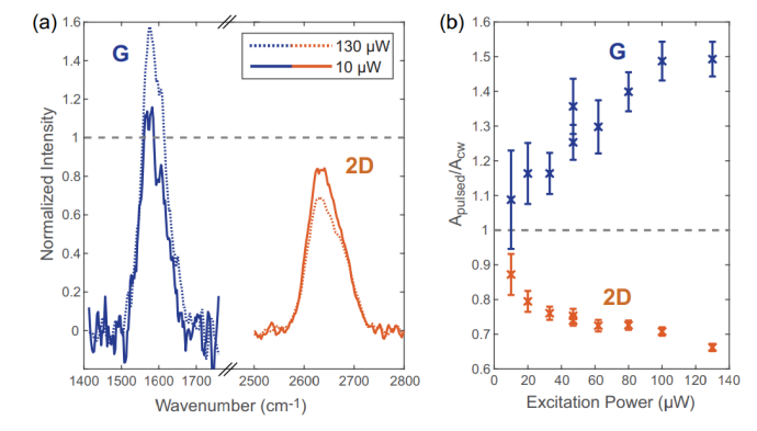 石墨烯中兩個主要的拉曼光譜帶G和2D的拉曼散射信號以相反的方式敏感地取決于激光強度。脈沖激光激發,達到的高電子溫度,導致在不同的光學共振態下,造成拉曼散射的不對稱費米-狄拉克分布。這會導致對G帶散射的部分Pauli阻擋的破壞性干擾量子路徑,這被觀察為G波段強度隨激光功率的超線性增加。另一方面,由于阻礙了建設性干擾的貢獻,2D波段表現出亞線性強度縮放。發現兩個波段相反的強度依賴性降低了觀察到的2D / G比,用于表征石墨烯樣品的關鍵量,對于約3000 K的電子溫度,其系數要提高兩倍以上。