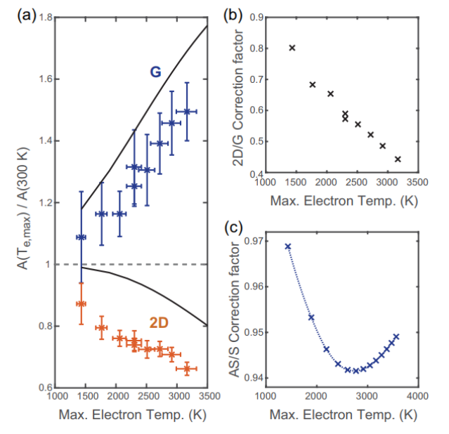 Figure 4. (a)G和2D波段拉曼散射區域的依賴性。(b)實驗獲得的用于提高電子溫度的2D / G比的校正因子。(d)由于電子溫度控制干擾,對G波段的anti-Stokes/Stokes比的預測校正因子。