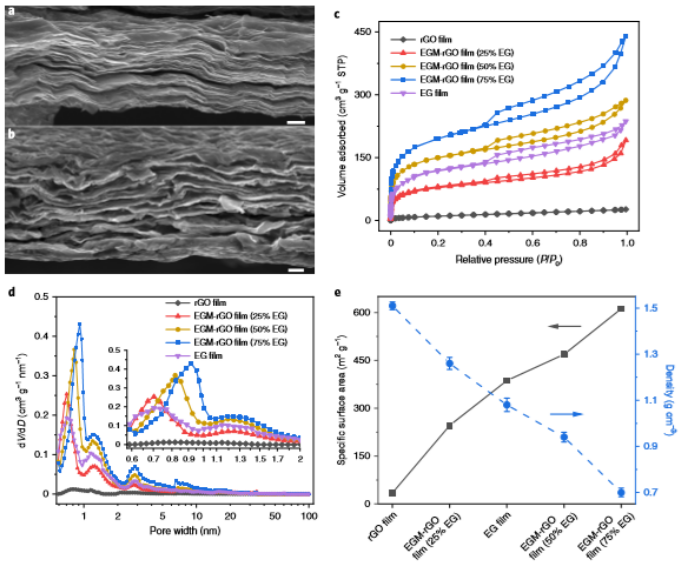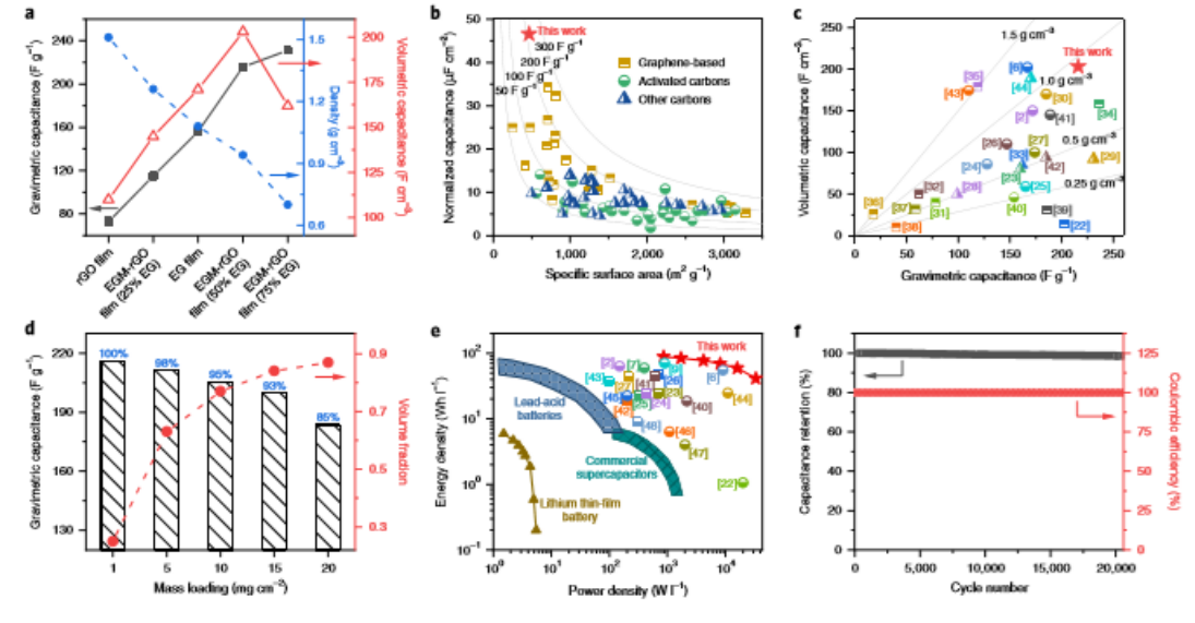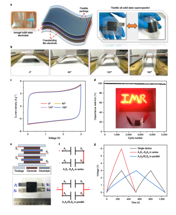 超級(jí)電容器在小型電子產(chǎn)品和電動(dòng)汽車上顯示出非凡的潛力,但往往受到電極低體積容量的限制,這在很大程度上是歸因于電荷存儲(chǔ)中對(duì)孔隙的低效利用。在此,我們?cè)O(shè)計(jì)了一種獨(dú)立式石墨烯層壓膜電極,該電極具有高效的孔隙利用率,可以緊湊地存儲(chǔ)電容性能量。該薄膜的層間間距可以精確調(diào)整,從而實(shí)現(xiàn)可調(diào)的孔隙率。因此,所制造的超級(jí)電容器在離子液體電解質(zhì)中可提供88.1 Wh l-1的堆體積能量密度,這是優(yōu)化孔隙度以實(shí)現(xiàn)緊湊儲(chǔ)能的關(guān)鍵突破。優(yōu)化后的薄膜電極組裝成基于離子凝膠的全固態(tài)柔性智能器件,具有多種可選輸出和優(yōu)越的穩(wěn)定性,在實(shí)際應(yīng)用中顯示出作為便攜式電源的巨大潛力。