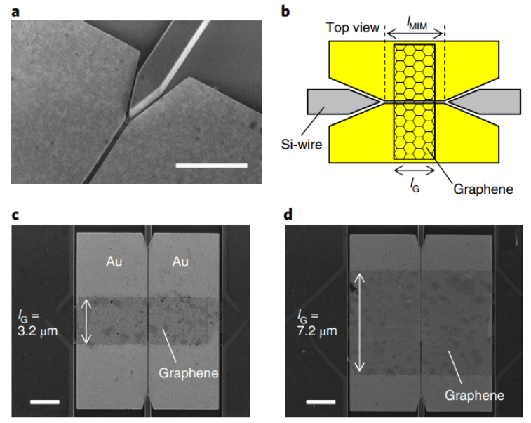 Au為40 nm。比例尺,1μm。(b)加載石墨烯的MIM-WG的俯視示意圖。石墨烯負載的MIM-WG的SEM圖,其中w