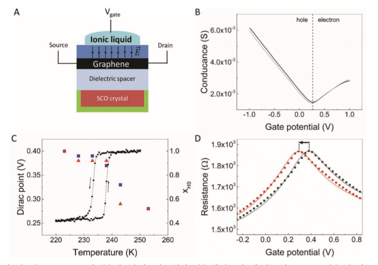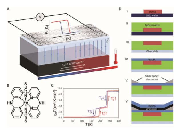 2]。C)化合物1單晶的磁化率(χmT)與溫度的關(guān)系。D)在SCO晶體上制作石墨烯晶體管的分步示意圖。