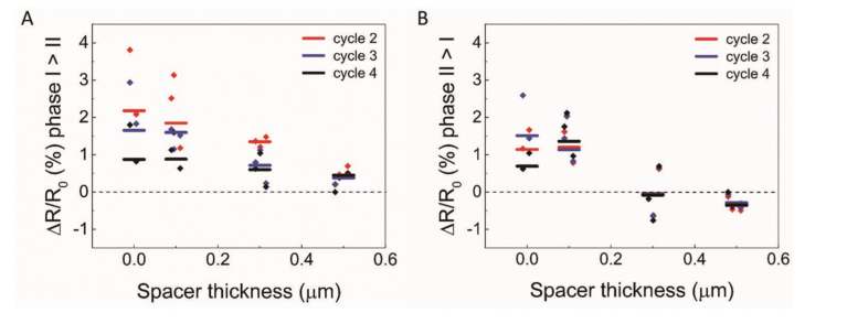 Figure 3. 遠(yuǎn)程檢測(cè)具有不同墊片厚度的自旋交叉。A)設(shè)備對(duì)第一階段到第二階段轉(zhuǎn)變的響應(yīng)。B) II至I階段過(guò)渡的設(shè)備響應(yīng)。