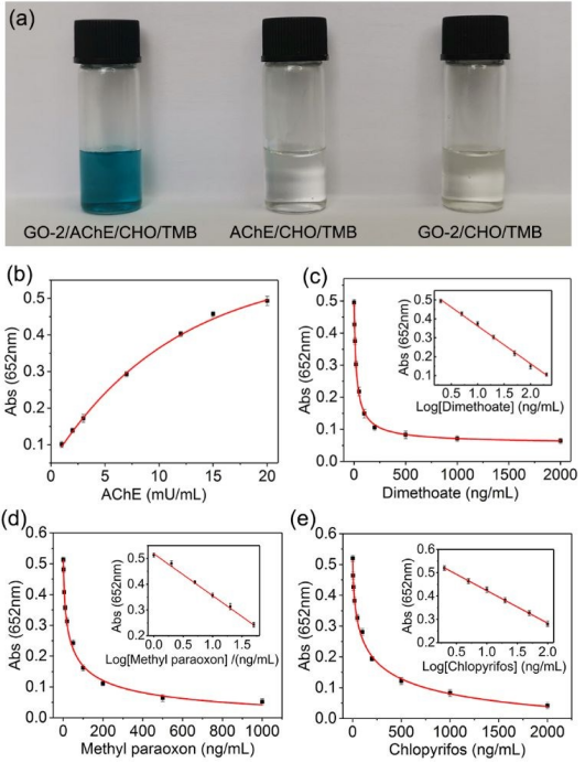 Figure 4. (a)通過GO-2/AChE/CHO介導的反應將TMB氧化為藍色oxTMB。(b)AChE的劑量相依曲線用于GO的比色分析。用于OPs檢測的劑量-響應曲線和半對數圖(插圖):(c)樂果,(d)甲基對氧磷,(e)毒死蜱。