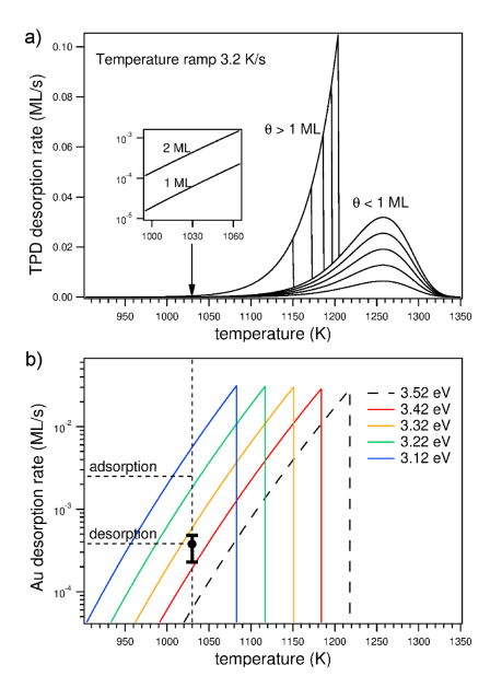 Figure 3. a)模擬的Au從Ru(0001)表面熱脫附圖像。b)取決于溫度的不同吸附能下的解吸速率。