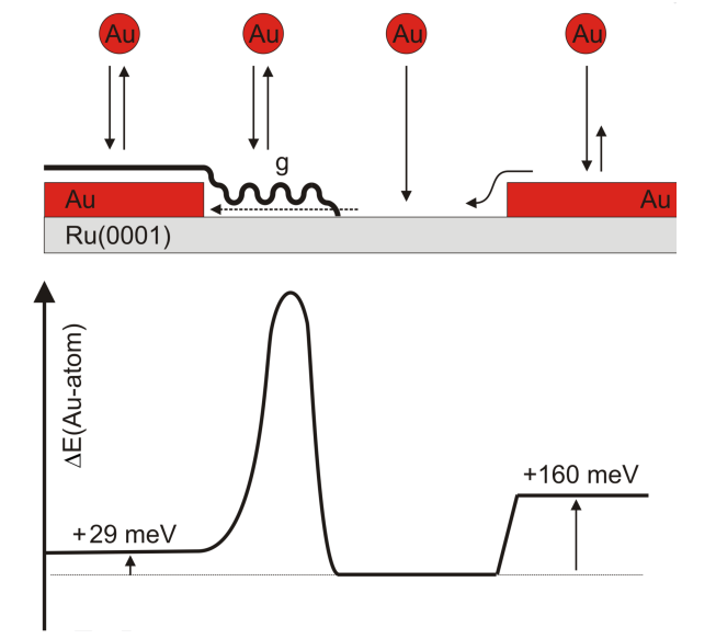 Figure 6.(頂部)Ru(0001)上Au沉積和嵌入的示意圖; (底部)與單個Au吸附原子的嵌入有關的電位分布在。勢能曲線說明在石墨烯邊緣的石墨烯-Ru相互作用更強,從而導致較大的插層勢壘。為便于觀察,能壘的高度和寬度被夸大,不應用于定量測量。