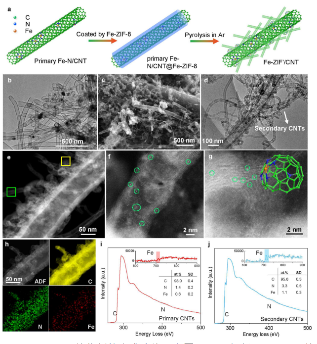 x摻雜的納米殼層模型。(h)Fe-ZIF’/CNT-1中C,N和Fe的STEM-EELS元素分布圖。(i,j)在初級(jí)CNT(i)和次級(jí)CNT(j)中N和Fe的平均原子含量的EELS定量分析。