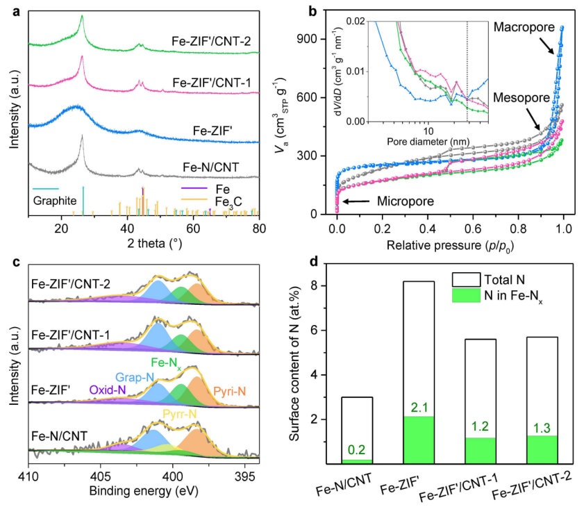 2吸脫附等溫線,插圖顯示相應(yīng)的基于BJH方法的中孔尺寸分布曲線。(c)N 1s 的XPS光譜。(d)樣品中總氮和配體N(Fe-N