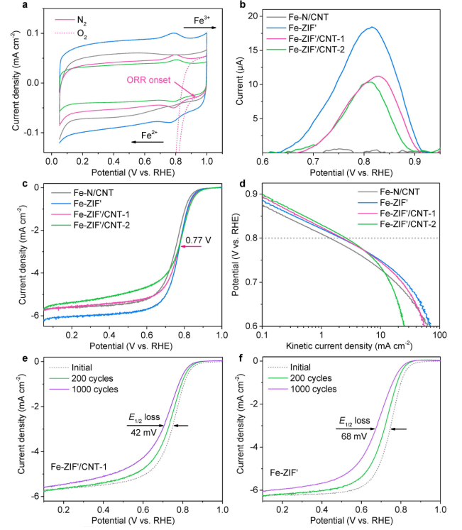 2飽和電解質(zhì)中的SWV測(cè)試。(c)LSV曲線和(d)相應(yīng)的Tafel圖。(e)Fe-ZIF’/CNT-1和(f)Fe-ZIF’催化劑經(jīng)過(guò)加速壓力測(cè)試后的LSV曲線。