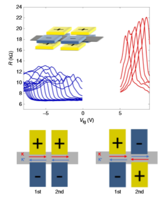 Fig. 5 手征性質的演示:谷分析儀在兩個柵對處于相同(左)或相反(右)谷極化狀態時進行測量。