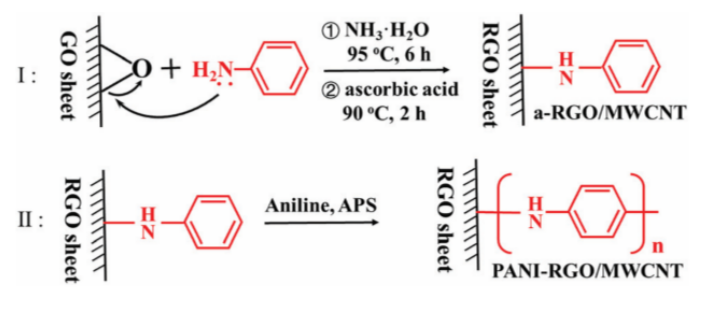 苯胺通過親核開環反應可與氧化石墨烯(GO)表面發生化學結合。然后,在多壁碳納米管(MWCNTs)存在的情況下,苯胺鍵合的GO會被還原為還原氧化石墨烯(RGO),這可以防止RGO聚合。通過苯胺的化學氧化聚合,將聚苯胺(PANI)接枝到RGO表面,得到的PANI-RGO/MWCNT三元納米復合材料,該材料可用作高性能超級電容器的電極。