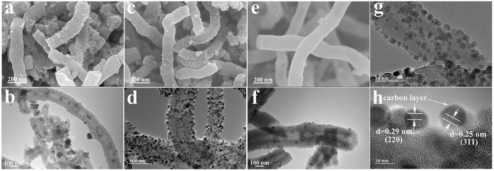 Figure 1.(a-b)W180-30樣品,(c-d)W180-60樣品,(e-f)W180-90樣品的SEM和TEM圖,(g-h)W180-60樣品的HRTEM圖。