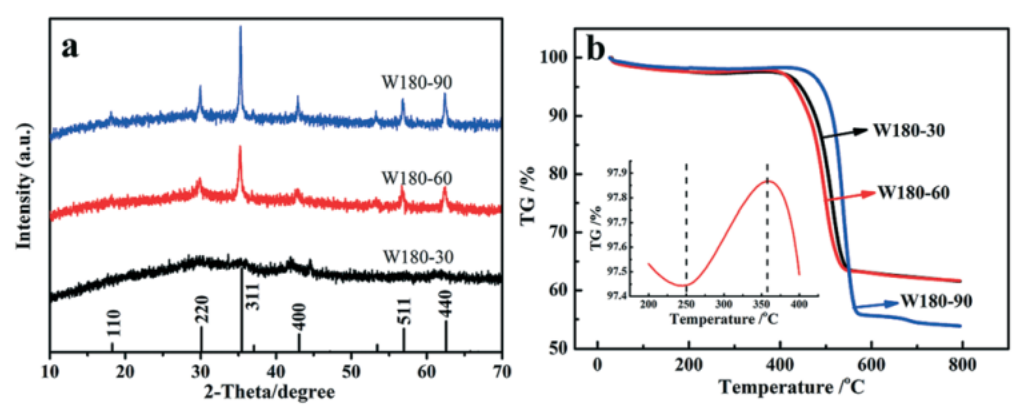 Figure 2. W180-30,W180-60和W180-90樣品的(a)XRD圖和(b)TGA曲線。
