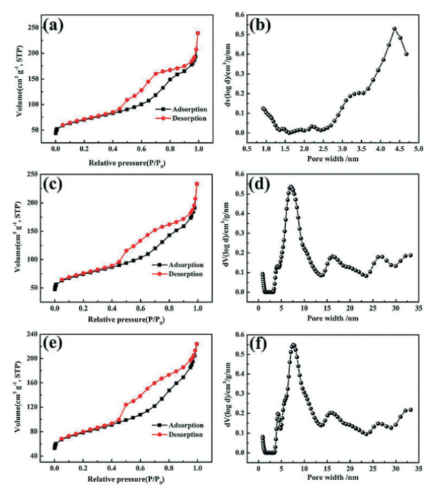Figure 3. (a-b)W180-30樣品,(c-d)W180-60樣品,(e-f)W180-90樣品的N2吸脫附等溫曲線和孔徑尺寸分布曲線。