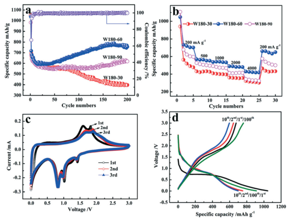 Figure 4.(a)三種樣品在500 mA g-1電流密度時的循環性能測試以及W180-60樣品的庫倫效率,(b)三種樣品的倍率性能,基于W180-60電極的(c)CV曲線和(d)GCD曲線。
