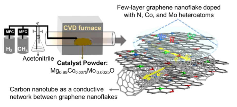 這里,開發了一種一步催化化學氣相沉積方法來生長高度石墨化的石墨烯納米片(GF)-碳納米管(CNT)雜化物,同時有N,Co和Mo單原子摻雜該雜化物(N-Co-Mo-GF/CNT)。如此高表面積的材料具有介孔結構,這有利于氧在催化劑薄膜中的質量傳輸,于是在堿性介質中展現出高的ORR和OER活性及穩定性。經研究證明,在這種M(金屬)-N-C催化劑中,M(Co,Mo)-C物種是主要的OER活性位點,而M和N-C主要充當ORR活性中心。該工作還系統研究了底物的選擇對ORR和OER活性的影響,當N-Co-Mo-GF/CNT催化劑沉積在Ni基底上,其ORR動力學電流和OER活性顯著提高,該性能可與迄今為止報道的最佳雙功能ORR/OER催化劑的性能相媲美。