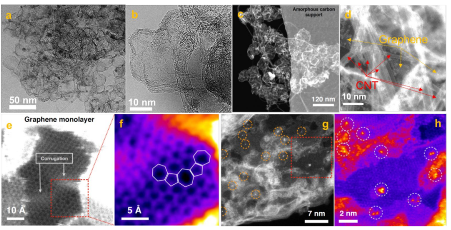 Figure 2. N-Co-Mo-GF/CNT的(a-b)HR-TEM和(c-h)STEM圖。(a)30-50 nm GFs和(b)數層GF的TEM圖,(c-d)CNTs交錯GFs的STEM圖,(e-f)石墨烯單層的高分辨STEM圖,呈現出蜂窩狀結構,(g-h)兩層或數層GFs的STEM圖,表明了單個金屬原子(亮點)分散在碳支撐上。