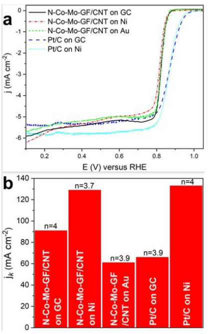 Figure 4. N-Co-Mo-GF/CNT 和Pt/C催化劑負載在不同基底上的ORR性能表征。(a)在O2飽和的0.1 M KOH溶液中的ORR極化曲線,(b)