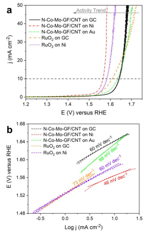 Figure 5. N-Co-Mo-GF/CNT 和Pt/C催化劑負載在不同基底上的OER性能測試。(a)OER極化曲線及(b)相應的Tafel斜率比較。