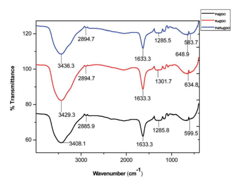 Figure 2. Pd@GO, Ru@GO和Pd/Ru@GO的FT-IR譜。