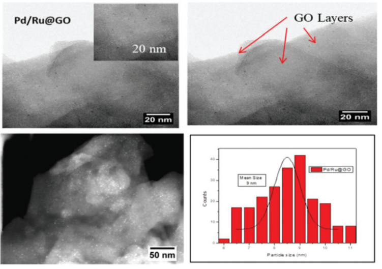 Figure 3. Pd/Ru@GO 的TEM圖及相應(yīng)的粒徑尺寸分布圖。