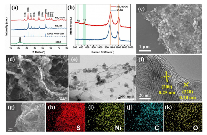 Figure 2.(a)NiS2/3DGO,NiS2 MF和3DGO的XRD圖比較,(b)NiS2/3DGO和3DGO的拉曼光譜,(c-d)NiS2/3DGO的SEM圖,(e-f)NiS2/3DGO的TEM和HRTEM圖,(g-k)NiS2/3DGO的SEM圖和相應(yīng)的元素分布情況。