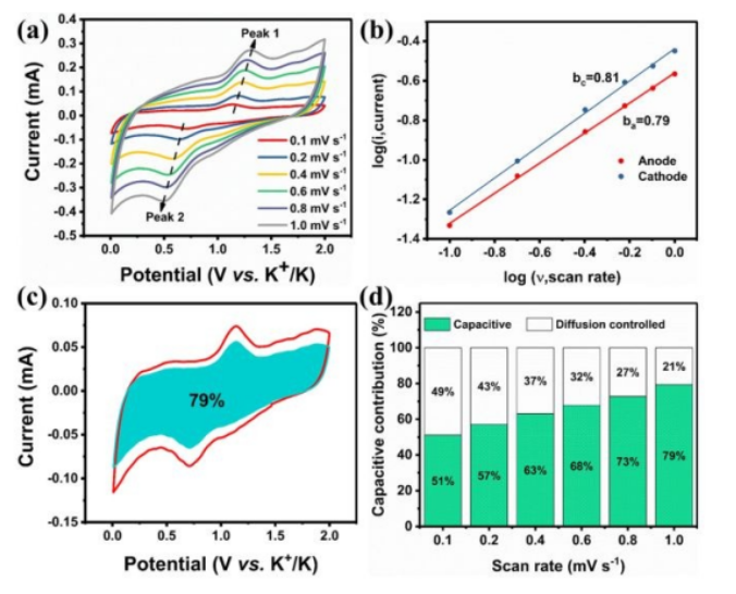 Figure 4.(a)NiS2/3DGO在不同掃速下的CV曲線,(b)log(i)與log(v)的線性關(guān)系,(c-d)電容容量和擴(kuò)散限制的容量在不同掃速下的貢獻(xiàn)百分比。