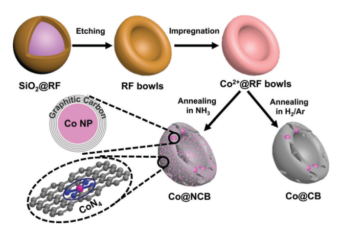 這里,首先通過溶膠-凝膠過程獲得單分散的SiO2@間苯二酚樹脂微球,經HF刻蝕處理獲得中空的碗狀結構,然后將該碗狀結構與醋酸鈷混合,對其進行加熱處理最終制備得鈷修飾的氮摻雜碳碗(Co@NCB)納米結構。其中,鈷在Co@NCB中以Co納米顆粒和CoN4種類兩種形式存在。經測試研究表明,Co@NCB復合物的氧還原性能優于商用Pt/C,其半波電位和穩定性都均得以提升。當Co@NCB用于鋅空電池時,實現了高的開路電壓,出色的功率密度以及良好的穩定性。