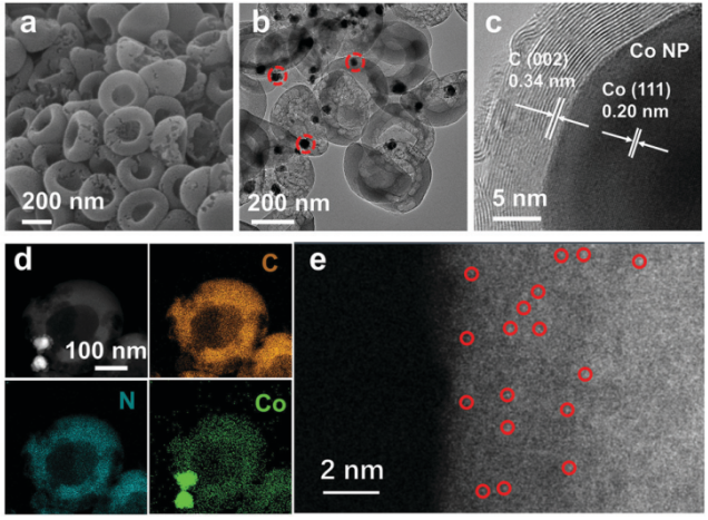 Figure 2. Co@NCB的(a)SEM圖,(b)TEM圖,(c)HRTEM圖,(d)EDX對應的元素分布圖,(e)球差-校正的STEM圖。