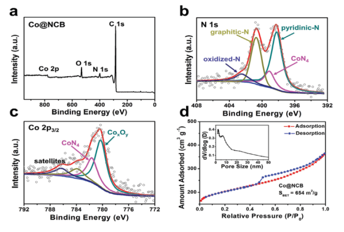 Figure 3. (a)XPS總譜,(b)高分辨N 1s XPS譜,(c)高分辨Co 2p XPS譜,(d)N2吸脫附等溫曲線及相應的BJH孔徑尺寸分布情況。