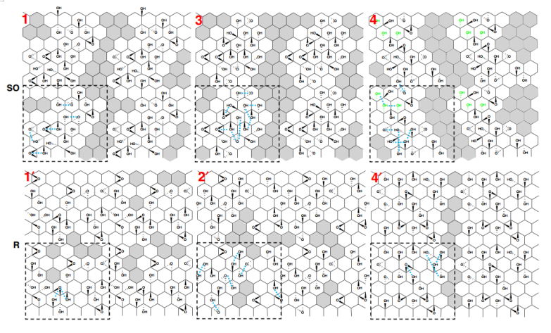Figure 3.分子動力學模擬學圖。半導(dǎo)體氧化石墨烯模型在水中的軌跡。(a)環(huán)氧官能團打開,導(dǎo)致兩性離子型的氧化石墨烯形成,創(chuàng)造了無凈電荷GO片,(b)表面羥基的去質(zhì)子化,導(dǎo)致液體水中的表面醇化物形成(藍色陰影圓圈)和過量的質(zhì)子化(橙色)。