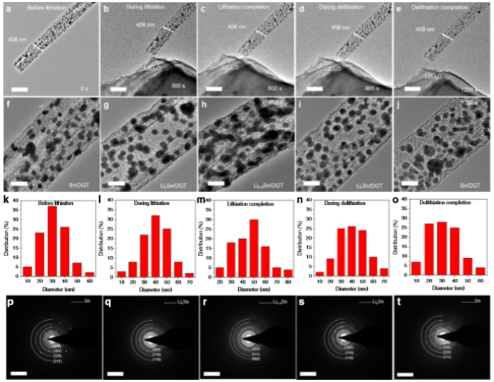 Fig. 5 Sn/DGT在嵌鋰-脫鋰循環中的原位TEM觀察。