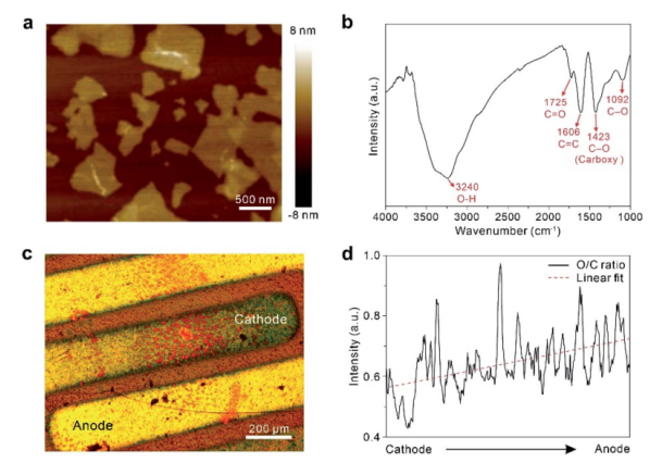 Figure 2. 制備的GO和構(gòu)建的g-GOF的表征。(a)GO的AFM圖,(b)GOF的FTIR轉(zhuǎn)換圖,(c)g-GOF覆蓋的Au電極的光學(xué)圖,(d)O/C原子比例的線性掃描EDS譜。