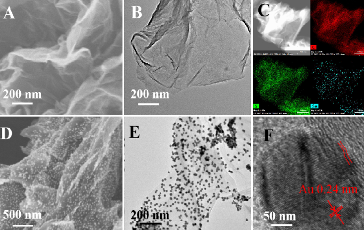 Figure 1. S-Se-GR的SEM圖(A),TEM圖(B)和元素映射圖(C);以及S-Se-GR/Au NPs的SEM圖(D),TEM圖(E)和HRTEM圖(F)。