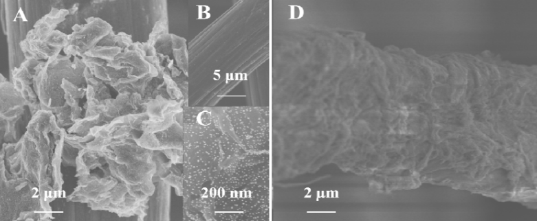 Figure 2. S-Se-GR/Au NPs/CP復(fù)合電極(A)和裸碳紙(B)的掃描電鏡圖;S-Se-GR/Au NPs/CP的HRSEM圖(C);GOD/S-Se-GR/Au NPs/CP復(fù)合體的掃描電鏡圖(D)。
