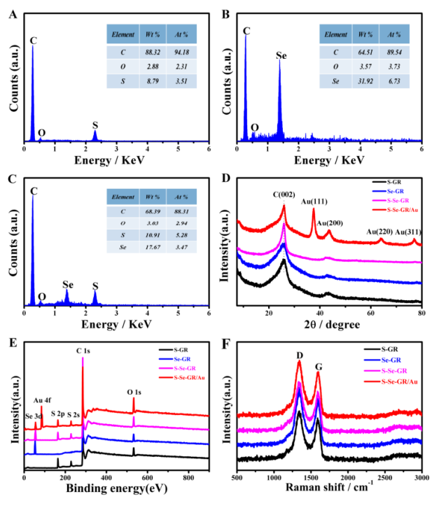 Figure 3. S-GR (A), Se-GR (B)和 S-Se-GR (C)的能譜分析;S-GR,Se-GR,S-Se-GR和S-Se-GR/Au NPs的XRD圖(D),XPS圖(E)和拉曼圖(F)。