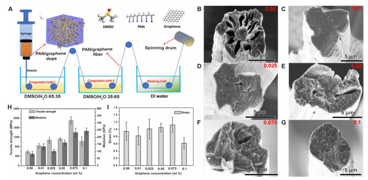 Figure 1. (A) PAN/石墨烯復合纖維制備過程;(B)-(G)分別是石墨烯含量為0、0.01wt%、0.025wt%、0.05wt%、0.075wt%和0.1wt% CF/石墨烯復合碳纖維斷面SEM圖;(H)和(I)分別是不同石墨烯含量CF/石墨烯復合碳纖維的拉伸強度、楊氏模量和斷裂伸長率結果