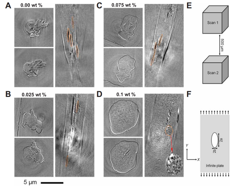 Figure 2. 不同石墨烯含量復合碳纖維的納米X射線斷層圖像;注:圖中橙色部分表示的是纖維的軸向裂紋,圓圈圈住的區域表示的是纖維的縱向納米缺陷