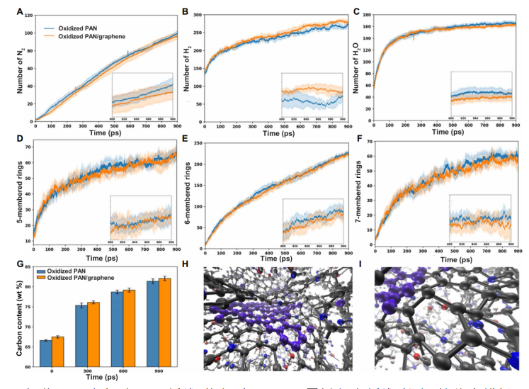 2O的產生量隨時間的變化;(D)~(F)分別是兩種纖維中5、6、7元環含量隨時間的變化;(G) 兩種纖維碳含量隨時間的變化;(H)和(I)表示的是含有石墨烯的纖維中形成的5、6、7元環結構示意圖