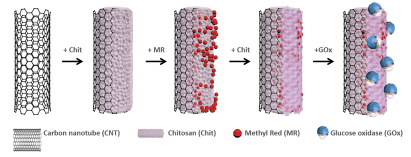 Fig. 1. 步驟示意圖,展示了合成CNT/[殼聚糖-MR]/殼聚糖/GOx催化劑的步驟。