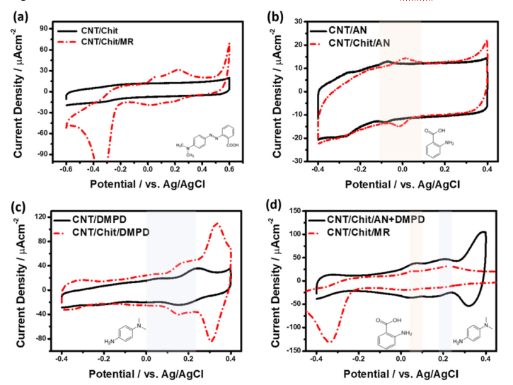 Fig. 2. (a) CNT/殼聚糖/MR;(b) CNT/殼聚糖/AN;(c) CNT/殼聚糖/DMPD;(d) CNT殼聚糖/AN+DMPD結構的循環伏安曲線。CV曲線在氮氣環境下,0.01 M PBS(pH 7.4)中,以50 mv/s速率掃描下獲得。
