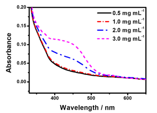-1的情況下,通過UV-Vis光譜測量的CNT/殼聚糖/MR結構的吸光度吸收峰,MR濃度從0.5到3 mg mL